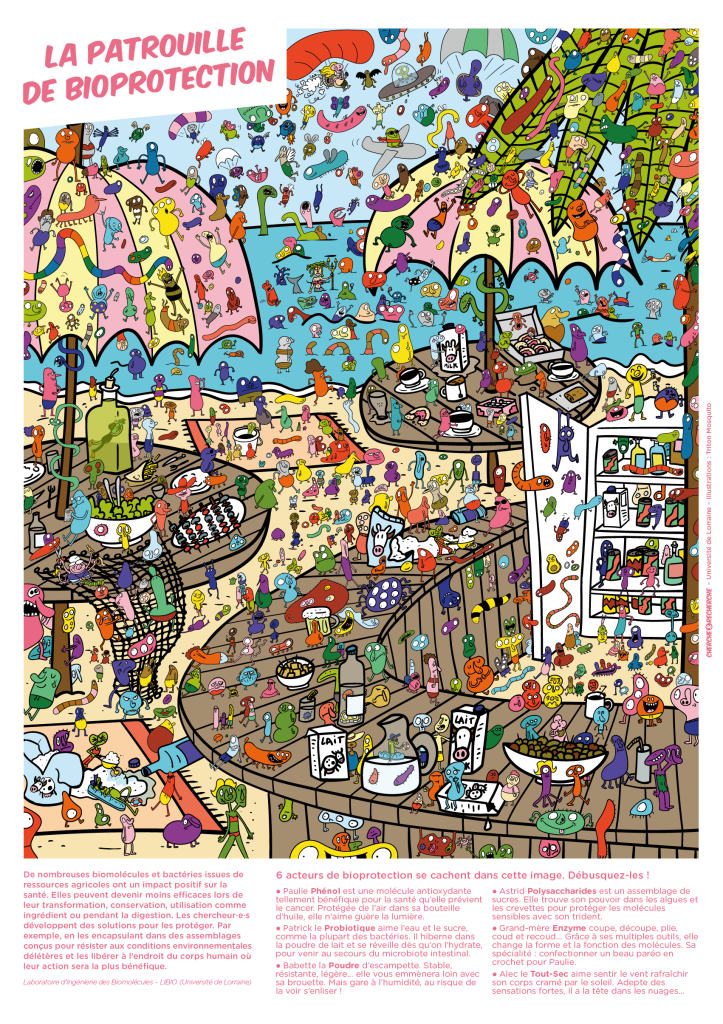 Proposé par l'Université de Lorraine, le programme "Cherche et Recherche" est un projet d’illustrations grand format sur la recherche, en vue d’une exposition itinérante inaugurée à l’occasion de la Fête de la science 2020. Le LIBio a ainsi pu participer à ce programme avec pour thème nos recherches sur les biomolécules au travers d'une "patrouille de bioprotection".